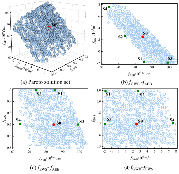 圖 2. 農(nóng)業(yè)系統(tǒng)經(jīng)濟效益(fAEB)、地下水均衡量(fGWB)和濕地生態(tài)需水量滿足度(fEWS)多目標優(yōu)化結果帕累托三維展示(a)及投影(b-d)。S0是協(xié)調(diào)發(fā)展程度最大的解決方案;S1在與S0相同的fAEB處具有最高的fEWS;S2在與S0相同的fGWB下具有最高的fEWS;S3和S4在與S0相同的fEWS下分別具有最高的fAEB和最高的fGWB。