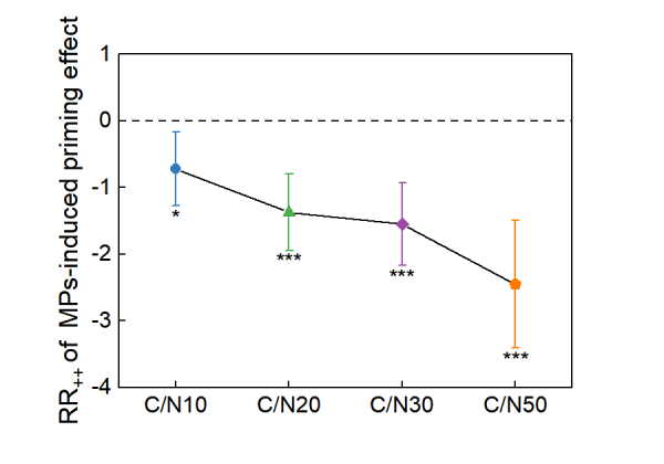 圖2 添加物不同C/N (MPs/礦質(zhì)氮)條件下,MPs誘導(dǎo)土壤有機(jī)質(zhì)分解對(duì)礦質(zhì)氮輸入響應(yīng)的平均效應(yīng)(RR + +)