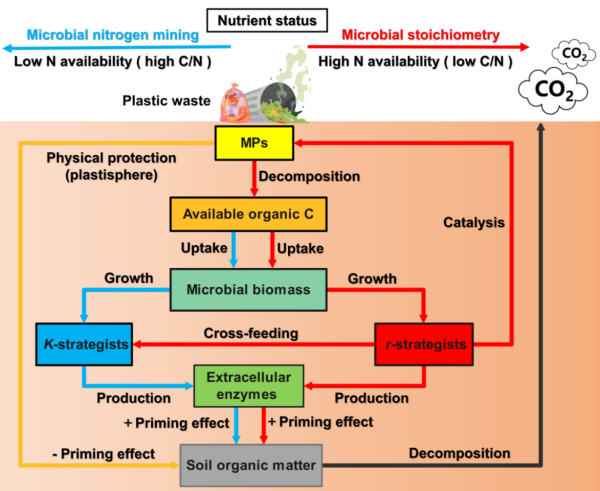 研究認(rèn)為,r-和K-策略微生物共同驅(qū)動(dòng)了MPs誘導(dǎo)激發(fā)效應(yīng)的強(qiáng)度和方向(圖3),該影響取決于土壤氮素有效性。總之,土壤養(yǎng)分狀況對(duì)SOM礦化的調(diào)控作用在預(yù)測(cè)MPs影響土壤碳循環(huán)時(shí)應(yīng)加以考慮。