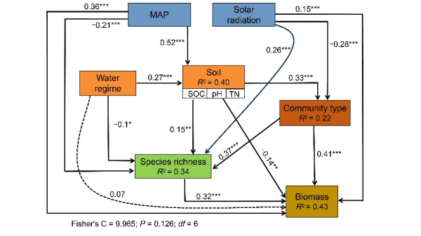 東北地理所科研人員結(jié)合國家濕地資源調(diào)查數(shù)據(jù)與遙感獲取的氣候信息數(shù)據(jù),以我國125個典型莎草類濕地樣點為研究對象,明確了我國國家尺度濕地地上生物量的空間格局,分析了莎草類濕地植物物種豐富度與地上生物量的關(guān)系,揭示了生物和非生物因素對地上生物量的貢獻及影響機制。研究結(jié)果表明,中國不同氣候區(qū)莎草類濕地地上生物量具有顯著差異。非生物因子和生物因子共同影響莎草類濕地地上生物量。其中,生物因子在決定地上生物量分布格局中占主導(dǎo)地位。植物物種豐富度對地上生物量具有促進作用,而地上生物量與物種豐富度的關(guān)系受群落類型調(diào)控。此外,年平均降水量是影響莎草類濕地地上生物量空間分布的最主要非生物因子,二者呈正相關(guān)關(guān)系。土壤性質(zhì)不僅直接影響地上生物量,還通過物種豐富度和群落類型間接影響地上生物量。