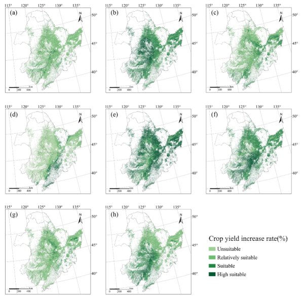 圖3 東北黑土區(qū)不同土壤管理方式下作物產(chǎn)量適宜性及空間分布