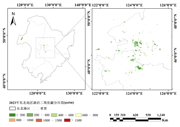 圖1 東北地區(qū)湖泊表層水體pCO2分布格局(2023年)