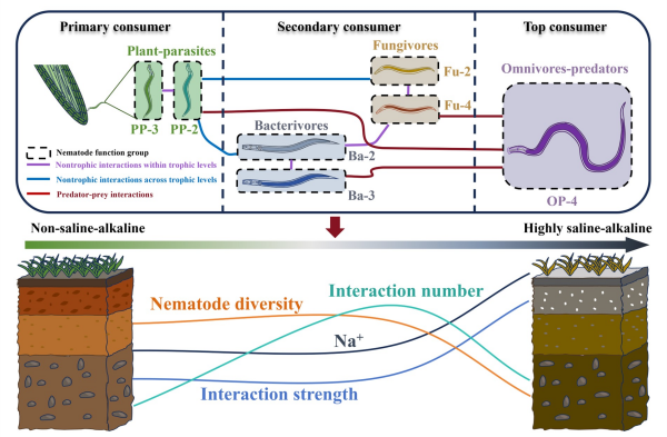 研究團(tuán)隊(duì)沿鹽堿梯度設(shè)置了非鹽堿化、弱鹽堿化、中度鹽堿化和高度鹽堿化四個等級的土壤樣點(diǎn)。通過將線蟲按取食行為和生活史策略劃分為不同功能群,并根據(jù)各功能群所處生態(tài)位進(jìn)一步將功能群間的相互作用劃分為三類:營養(yǎng)級內(nèi)非營養(yǎng)相互作用、跨營養(yǎng)級非營養(yǎng)相互作用以及捕食者-被捕食者相互作用,系統(tǒng)構(gòu)建了線蟲功能群網(wǎng)絡(luò)。