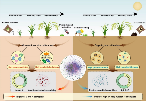 有機農(nóng)業(yè)作為一種環(huán)境友好型農(nóng)業(yè)管理方式,在提升土壤健康和促進可持續(xù)農(nóng)業(yè)發(fā)展方面受到廣泛關(guān)注。然而,有機種植如何通過調(diào)控土壤微生物群落提升碳利用效率(CUE),進而增強土壤碳匯功能,其機制尚不清晰。近日,中國科學(xué)院東北地理與農(nóng)業(yè)生態(tài)研究所農(nóng)田分子生態(tài)學(xué)科組在東北黑土區(qū)系統(tǒng)比較了長期有機與常規(guī)兩種水稻栽培模式下,土壤微生物CUE在水稻生育期內(nèi)的動態(tài)變化,并結(jié)合土壤理化性質(zhì)、微生物群落結(jié)構(gòu)、酶活性及生態(tài)化學(xué)計量學(xué)特征,深入解析了微生物CUE驅(qū)動土壤有機碳動態(tài)的特征與機制。