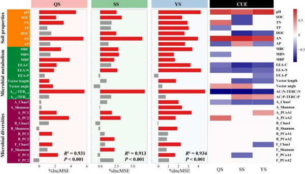 有機栽培提高了土壤pH值和速效養(yǎng)分含量,緩解了微生物碳和氮限制,從而增強了微生物化學(xué)計量平衡和碳利用效率。常規(guī)栽培下,在水稻生長的后期微生物為應(yīng)對養(yǎng)分脅迫,分配更多能量用于合成胞外酶,導(dǎo)致微生物多樣性和生物量下降,最終降低了微生物CUE(圖1)。土壤有效氮含量和碳氮閾值元素比(TERC:N)是微生物CUE的關(guān)鍵調(diào)控因子(圖2)。研究發(fā)現(xiàn)地桿菌科(Geobacteraceae)相關(guān)屬、Ferruginibacter和Propioniciclava等通過調(diào)節(jié)微生物的生長策略和代謝途徑對CUE產(chǎn)生顯著影響。具有高rRNA操縱子(rrn)拷貝數(shù)的微生物模塊更傾向于采用快速生長策略(Y策略),促進碳向生物量合成方向分配,從而提升CUE(圖1)。本研究強調(diào)了有機農(nóng)業(yè)在提高土壤微生物碳利用效率以減少生態(tài)系統(tǒng)碳損失方面的潛力,為優(yōu)化土地管理策略以實現(xiàn)土壤碳封存和推進可持續(xù)農(nóng)業(yè)實踐提供理論基礎(chǔ)。