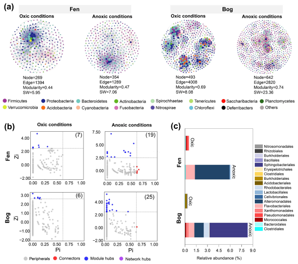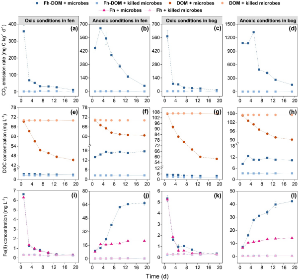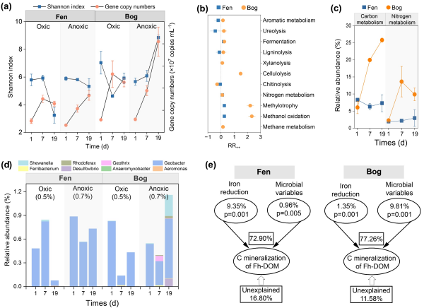 東北地理所土壤與環(huán)境演化學科組研究人員采集了兩種典型的泥炭樣本(礦養(yǎng)型和雨養(yǎng)型),通過將水鐵礦結(jié)合的DOM的復合物(Fh-DOM)與微生物進行微宇宙培養(yǎng)實驗。研究結(jié)果顯示,在有氧條件下,鐵氧化物可以穩(wěn)定DOM,而在厭氧條件下,鐵還原使得Fh-DOM更容易被微生物分解。Fh-DOM的碳礦化是通過鐵還原誘導微生物對Fh-DOM中養(yǎng)分的挖掘。Fh-DOM的添加在厭氧條件下導致更高的細菌多樣性和生長。同時,在厭氧條件下,Fh-DOM的添加顯著增加了甲烷代謝、纖維素分解、木聚糖分解、木質(zhì)素分解和芳香族代謝等功能。由于Fh-DOM在厭氧條件下提供養(yǎng)分,這些養(yǎng)分促進了微生物的生長和多樣性,并增強了細菌群落的穩(wěn)定性。