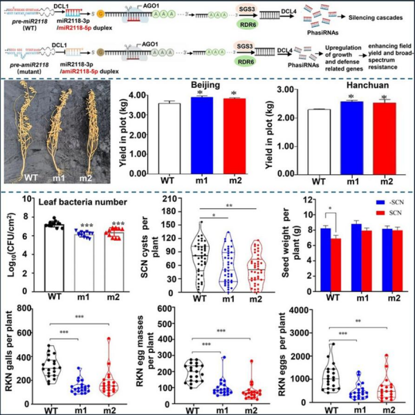與野生型大豆相比,amiR2118a/b突變體的pre-amiR2118a/b二級結(jié)構(gòu)發(fā)生顯著改變,同時成熟miR2118a/b的表達水平顯著下調(diào),導致下游介導的phasiRNAs生物合成也受到顯著抑制。無論在正常條件下還是接種細菌性斑點病菌Pseudomonas syringae pv. glycinea (Psg)后,amiR2118a/b突變體內(nèi)與光合作用、脂肪酸合成相關(guān)基因,以及防御反應(yīng)相關(guān)基因(如抗線蟲關(guān)鍵基因GmSNAP18)均呈顯著上調(diào)表達,使得植株處于防御“預(yù)警”狀態(tài)。值得注意的是,amir2118a/b雙突變體m1和m2對葉際細菌病害Psg和土傳線蟲病害(大豆胞囊線蟲和根結(jié)線蟲)表現(xiàn)出抗性增強,實現(xiàn)了對地上部與地下部病害的跨類型防控。兩年田間試驗證實,突變體單株莢數(shù)、粒數(shù)、粒重均顯著優(yōu)于野生型,小區(qū)測產(chǎn)實現(xiàn)7.4%-8.7%的穩(wěn)定增產(chǎn),成功打破了抗病性與產(chǎn)量的協(xié)同限制。本研究提出了一種作物復(fù)雜性狀改良的可行策略,即利用CRISPR/Cas系統(tǒng)精準靶向miRNAs非功能區(qū)進行突變,通過調(diào)控phasiRNA級聯(lián)效應(yīng)進而提升大豆抗病性與產(chǎn)量(圖1)。