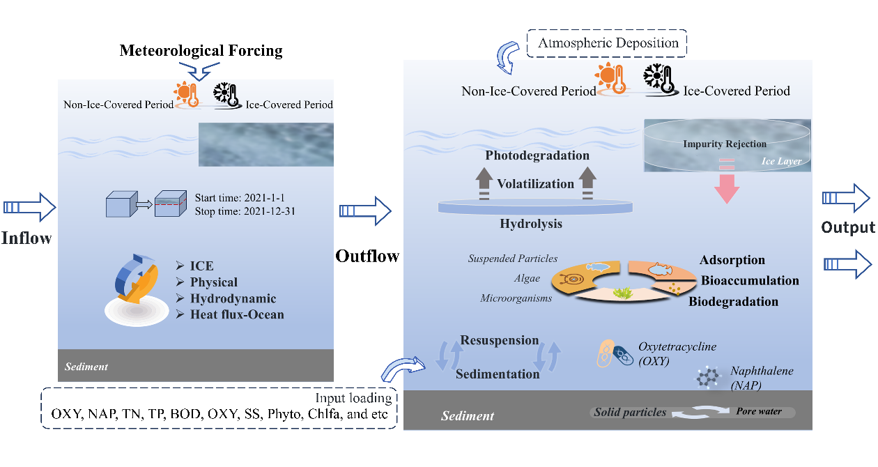 隨著對(duì)寒區(qū)湖泊研究的不斷深入,污染物在冰封期表現(xiàn)出的特異性行為已引起學(xué)界關(guān)注。然而,目前多數(shù)寒區(qū)湖泊的污染物模擬模型研究仍以非冰封期為主,因此補(bǔ)全污染物在寒區(qū)湖泊的全季節(jié)連續(xù)模擬具有重要意義。東北地理所水環(huán)境健康與模擬學(xué)科組基于前期對(duì)抗生素和多環(huán)芳烴兩類污染物在寒區(qū)湖泊全季節(jié)的環(huán)境機(jī)理研究,在查干湖創(chuàng)新性的構(gòu)建了全季節(jié)的水動(dòng)力-新污染物耦合模型,補(bǔ)全了模型的冰封模塊,首次精準(zhǔn)刻畫新污染物在寒區(qū)湖泊的全季節(jié)連續(xù)性時(shí)空動(dòng)態(tài),探究其季節(jié)性驅(qū)動(dòng)機(jī)制并預(yù)測(cè)其潛在風(fēng)險(xiǎn)。