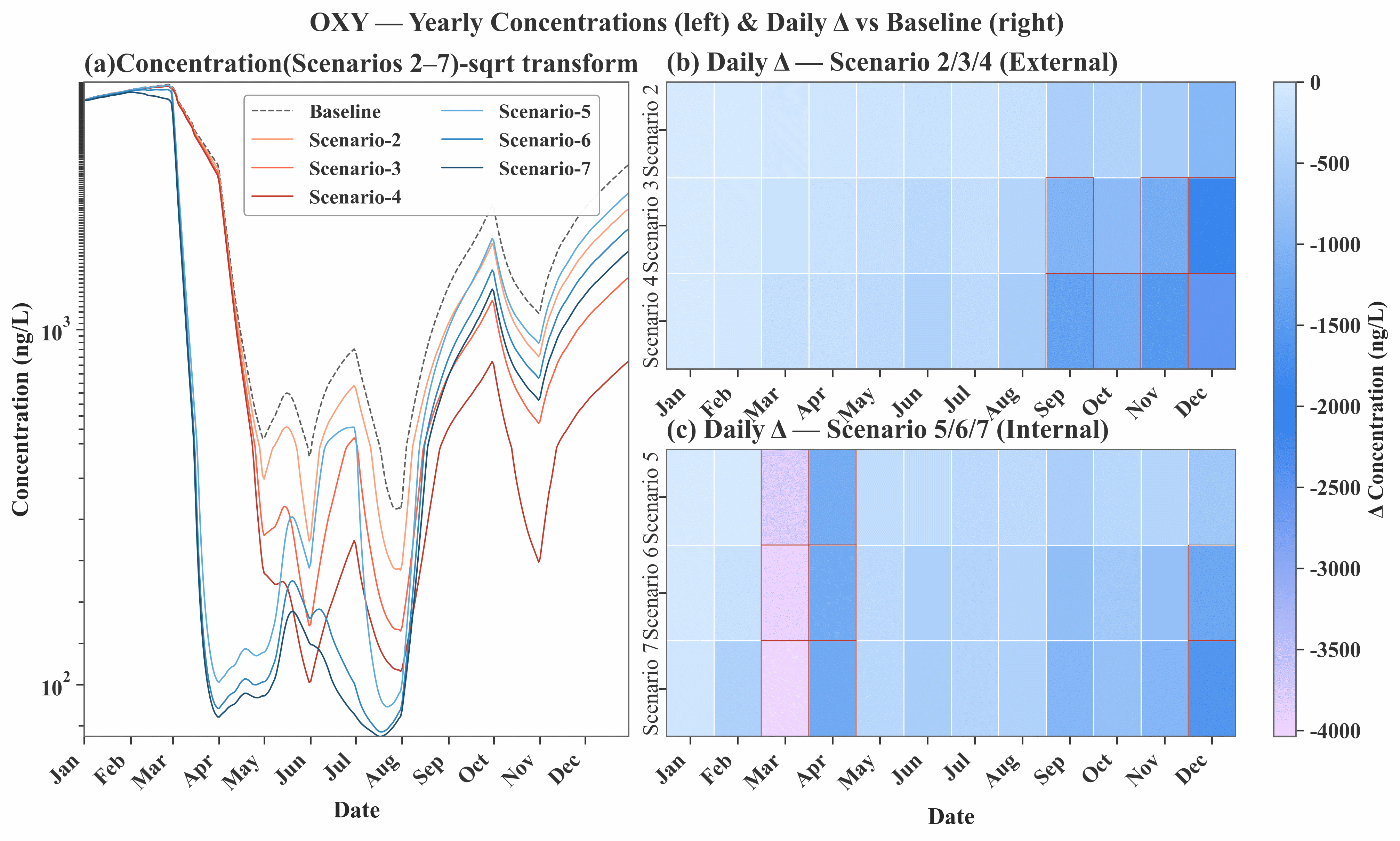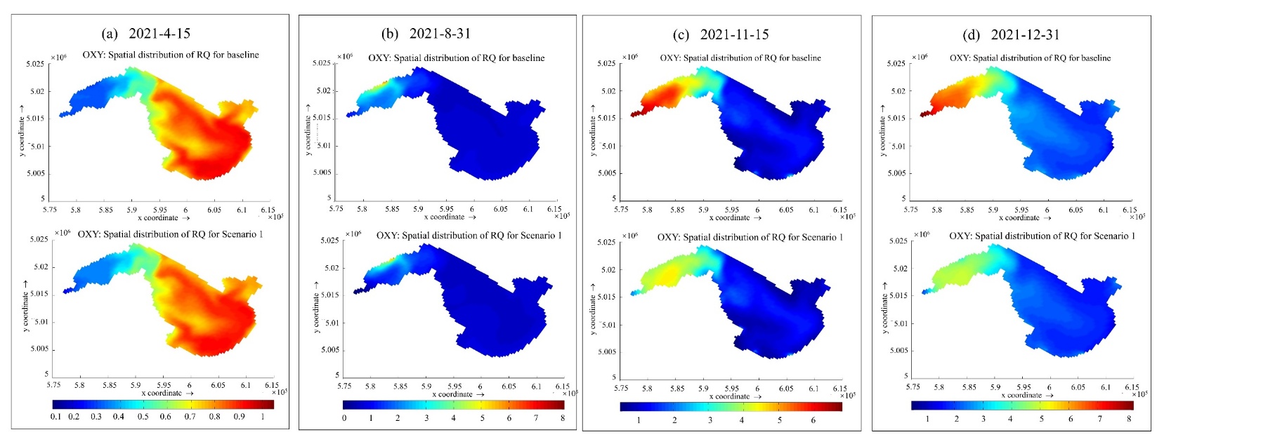 研究團(tuán)隊(duì)選取了兩種代表性污染物,基于其環(huán)境行為特征,運(yùn)用Delft 3D軟件平臺(tái),自主研發(fā)冰封模塊和新污染物模塊,構(gòu)建寒區(qū)湖泊全季節(jié)水動(dòng)力-新污染物耦合模型。基于查干湖實(shí)際污染現(xiàn)狀設(shè)計(jì)了差異化情景模擬,分別為:外源污染負(fù)荷削減;減少內(nèi)源污染釋放;引水調(diào)控方案改變。通過三類措施的情景模擬,探究查干湖污染治理的有效路徑,以及污染物是否存在風(fēng)險(xiǎn)躍遷的潛在危害。