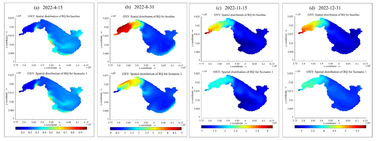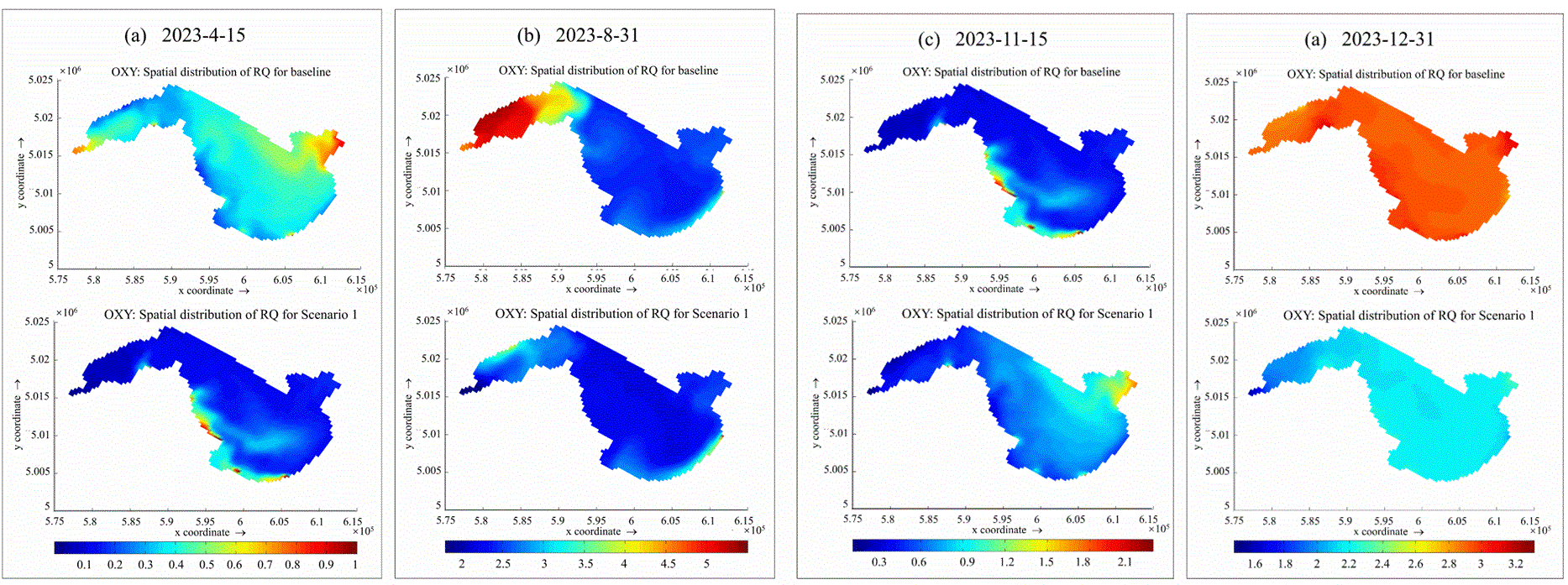 圖2 引水調(diào)控早期抗生素風(fēng)險(xiǎn)指數(shù)的空間分布與基準(zhǔn)情況對(duì)比