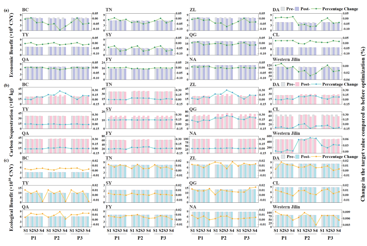 圖2不同水資源–灌溉情景與管理策略下吉林西部各區(qū)域優(yōu)化前后經(jīng)濟(jì)效益、碳固存量與生態(tài)效益的比較及變化
