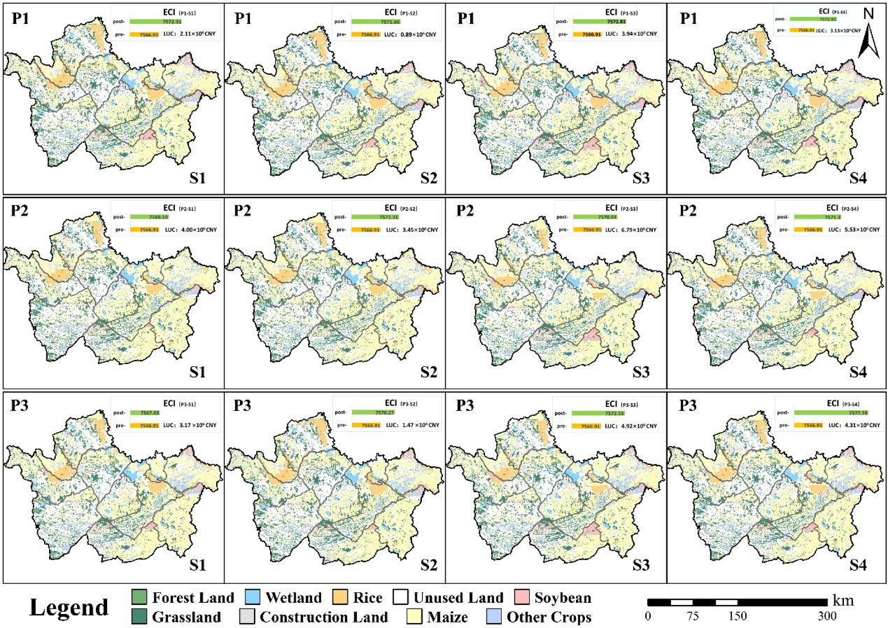 針對(duì)上述挑戰(zhàn),中國(guó)科學(xué)院東北地理與農(nóng)業(yè)生態(tài)研究所聯(lián)合吉林省水文與水資源局,以吉林西部為典型研究區(qū),突破了傳統(tǒng)水土資源配置中總量?jī)?yōu)化與空間格局分離的研究范式,構(gòu)建了一個(gè)水–碳–糧–生態(tài)多要素協(xié)同的水土資源優(yōu)化配置與空間布局一體化研究框架,實(shí)現(xiàn)了從宏觀資源配置到微觀空間落地的系統(tǒng)銜接。在宏觀尺度上,模型以農(nóng)業(yè)灌溉用水約束為核心,綜合考慮經(jīng)濟(jì)收益、糧食生產(chǎn)、固碳效益與生態(tài)效益等多重目標(biāo),設(shè)置經(jīng)濟(jì)優(yōu)先(P1)、碳匯優(yōu)先(P2)和綜合協(xié)調(diào)(P3)三類(lèi)決策偏好,并在平水年與枯水年條件下,分別引入常規(guī)灌溉與節(jié)水灌溉情景(S1-S4),刻畫(huà)不同水資源條件與管理策略下水土資源配置方案的響應(yīng)差異。在微觀尺度上,將宏觀優(yōu)化的土地利用結(jié)果作為空間約束條件,引入生態(tài)連通性(ECI)與土地利用轉(zhuǎn)化成本(LUC)指標(biāo),對(duì)土地利用類(lèi)型在柵格尺度上的空間布局進(jìn)行優(yōu)化,實(shí)現(xiàn)水土資源配置與空間格局調(diào)控的協(xié)同統(tǒng)一。研究結(jié)果表明,各類(lèi)情景下農(nóng)業(yè)灌溉用水量均顯著降低,節(jié)水幅度約為3%–18%,水資源利用效率明顯提升。不同決策偏好對(duì)應(yīng)的資源配置路徑和綜合效益存在顯著差異:經(jīng)濟(jì)優(yōu)先決策下(P1),策略傾向于保留高價(jià)值但耗水的水稻種植,對(duì)經(jīng)濟(jì)損失的控制較好;固碳優(yōu)先情景(P2)下,通過(guò)顯著增加玉米等高碳匯作物種植比例,實(shí)現(xiàn)了最優(yōu)的節(jié)水效果和碳匯增益,區(qū)域碳固存量增加約2.97×10?kg;綜合協(xié)調(diào)情景(P3)在多目標(biāo)之間實(shí)現(xiàn)了相對(duì)均衡,灌溉用水量減少4.58%–16.86%,碳固存量提升約2.86%。相關(guān)結(jié)果可為吉林西部不同縣市因地制宜制定差異化資源管理策略提供依據(jù)。在滿足宏觀配置約束的前提下,通過(guò)對(duì)農(nóng)業(yè)用地與生態(tài)用地的合理調(diào)整,可在較低土地轉(zhuǎn)化成本條件下有效提升區(qū)域生態(tài)連通性,生態(tài)連通性指數(shù)整體提高約0.03%–0.14%。該研究從水–碳–糧–生態(tài)多要素耦合視角出發(fā),為干旱與半干旱農(nóng)業(yè)區(qū)水土資源精細(xì)化管理提供了系統(tǒng)化決策支持框架,對(duì)區(qū)域農(nóng)業(yè)結(jié)構(gòu)調(diào)整、水資源調(diào)控及生態(tài)修復(fù)具有重要參考價(jià)值。