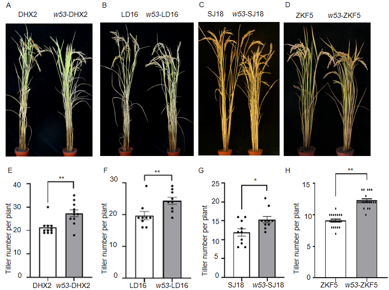 東北地理所水稻分子育種團(tuán)隊(duì)近年來一直探索OsWRKY53的生物學(xué)功能,前期研究已報(bào)道,OsWRKY53通過油菜素內(nèi)酯(BR)信號(hào)通路調(diào)控株高和葉角;也參與負(fù)調(diào)控水稻的孕穗期耐冷性。多年多點(diǎn)的田間試驗(yàn)表明,不同背景下的oswrky53材料均表現(xiàn)半矮化、多分蘗的理想株型,展現(xiàn)出一種具有重要應(yīng)用潛力的優(yōu)良性狀組合(圖1)。