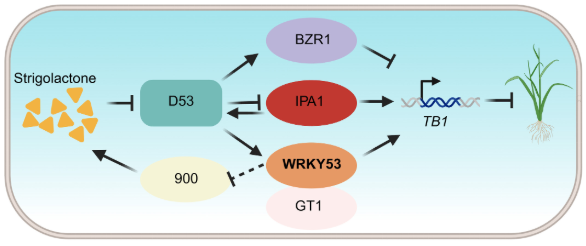 圖2. OsWRKY53調(diào)控水稻分蘗及微調(diào)獨(dú)腳金內(nèi)酯信號(hào)的模式圖