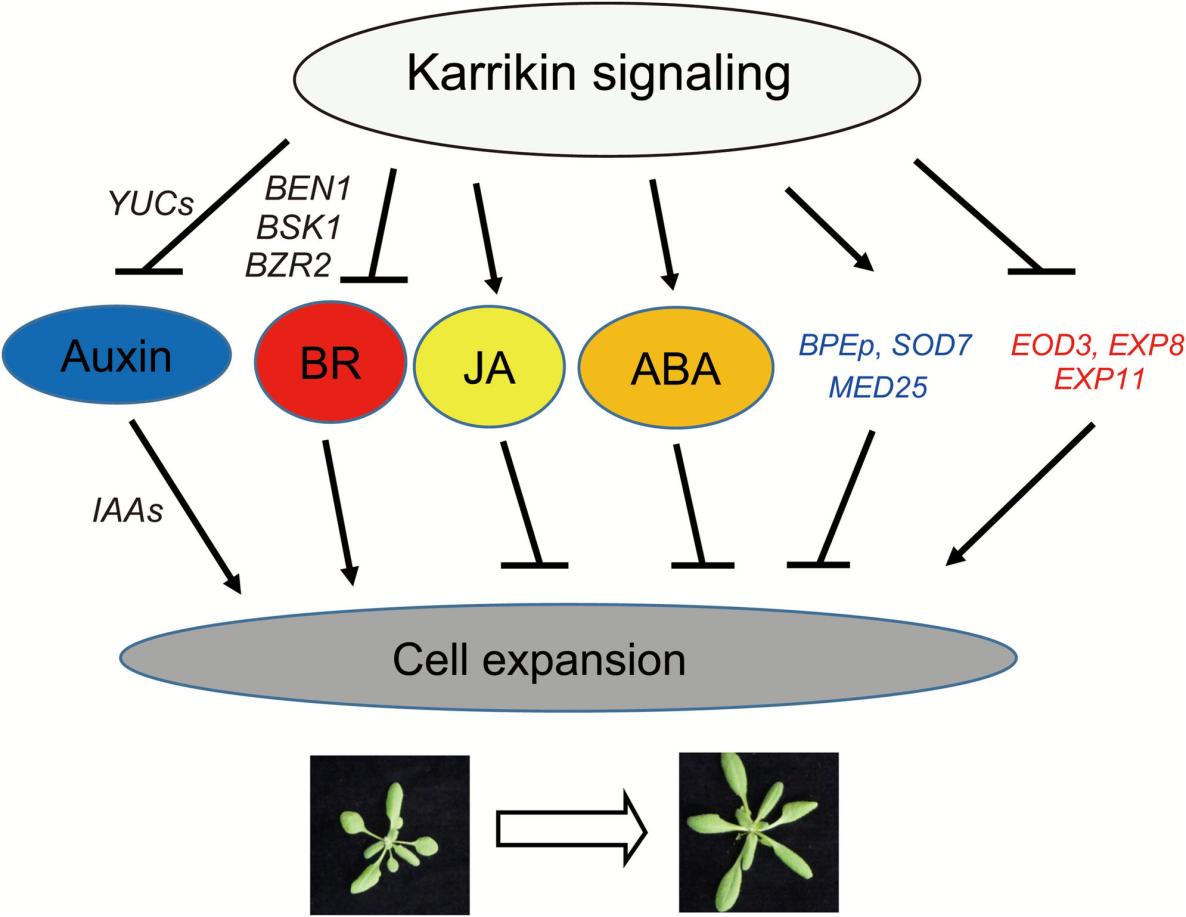 圖4. 擬南芥KAR信號(hào)通路調(diào)控蓮座葉大小的機(jī)制模型