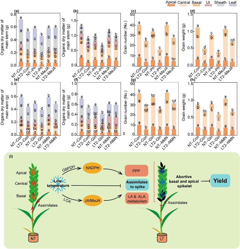 該研究于小麥藥隔期開展低溫處理試驗,結(jié)果表明,低溫處理導(dǎo)致小麥主莖產(chǎn)量顯著下降,其中穗基部和頂部小穗的敗育率顯著升高。通過整合常規(guī)代謝組學(xué)、空間代謝組學(xué)及轉(zhuǎn)錄組學(xué)分析,闡明了小麥葉片、穗下節(jié)間以及穗部不同區(qū)域?qū)Φ蜏孛{迫的代謝和轉(zhuǎn)錄差異響應(yīng),證實低溫脅迫下,小麥通過激活亞油酸/α-亞麻酸代謝啟動茉莉酸介導(dǎo)的防御反應(yīng),并通過磷酸戊糖途徑維持碳代謝平衡和能量供應(yīng)。這兩條途徑的協(xié)同作用,決定了碳水化合物能否從源葉高效轉(zhuǎn)運至穗部,并在小穗間進行合理分配,進而有效緩解低溫導(dǎo)致的產(chǎn)量損失。該研究為解析作物逆境適應(yīng)與產(chǎn)量形成的平衡調(diào)控機制提供了全新視角,也為小麥田間抗逆栽培技術(shù)的指定與優(yōu)化提供了重要理論依據(jù)。