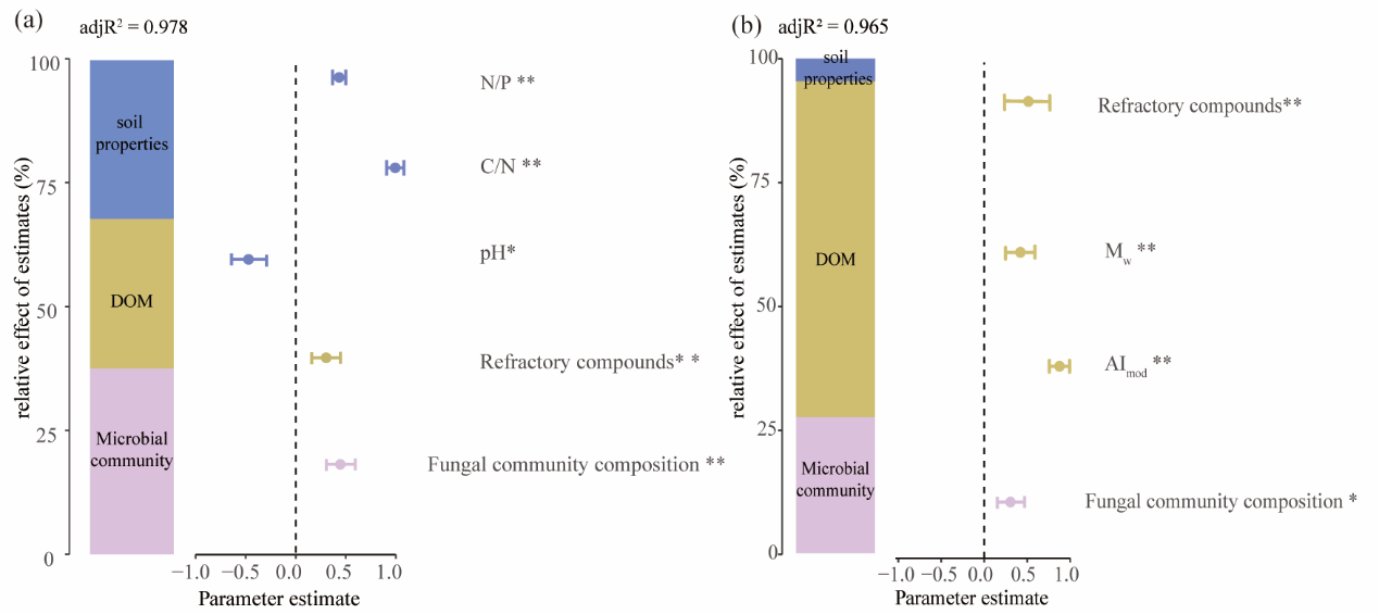 圖2 多元線性回歸結(jié)合層次分割法解釋土壤理化性質(zhì)、微生物群落及DOM對表土(a)和底土(b)中MNC積累的相對貢獻(xiàn)