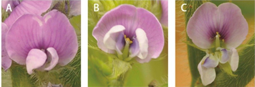 A.正常大豆花,B.TCP2基因異位表達(dá),C.TCP3基因異位表達(dá)