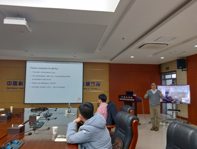 劉福來以“CO2 elevation modulates leaf gas exchange response to drought in C3 and C4 monocots and dicots species” 為題,通過兩個(gè)科學(xué)問題的提出與破解為主線,在試驗(yàn)設(shè)計(jì)、試驗(yàn)方法方面進(jìn)行了深入講解,向現(xiàn)場的科研人員和研究生介紹自己最新的研究成果,并且與現(xiàn)場的科研人員進(jìn)行了熱烈的交流和討論,使到場參加本次講座的科研人員和研究生受益匪淺。