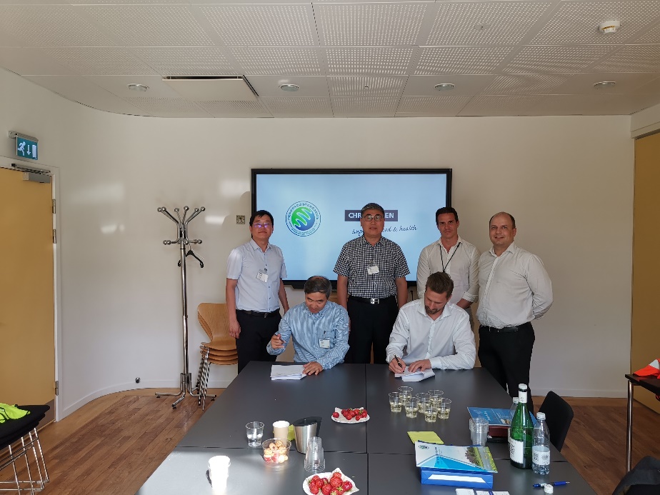 6月24日至25日,何興元所長一行應(yīng)丹麥CHR-HANSEN集團(tuán)邀請,考察了集團(tuán)位于丹麥Hvidovre的有益菌劑生產(chǎn)基地及植物創(chuàng)新研發(fā)中心。期間,何興元所長介紹了我所基本情況及我所在農(nóng)業(yè)研究領(lǐng)域所取得的主要成果,CHR-HANSEN基地負(fù)責(zé)人Kim Muller Christensen博士介紹了CHR-HANSEN集團(tuán)的發(fā)展歷程及在全球范圍的經(jīng)營情況、科技創(chuàng)新布局等,植物創(chuàng)新研發(fā)中心主管Lars Molbak博士介紹了Plant Health Innovation研發(fā)中心的基本情況及未來的合作方向。李向楠研究員就其承擔(dān)的CHR-HANSEN首個中國項目情況進(jìn)行了介紹。會議中,何興元所長與CHR-HANSEN集團(tuán)簽署了科技創(chuàng)新合作協(xié)議,雙方將以合作研究項目為契機(jī),進(jìn)一步加大科研合作。會后,何興元所長一行在CHR-HANSEN基地負(fù)責(zé)人等陪同下考察了CHR-HANSEN有益菌劑生產(chǎn)線。