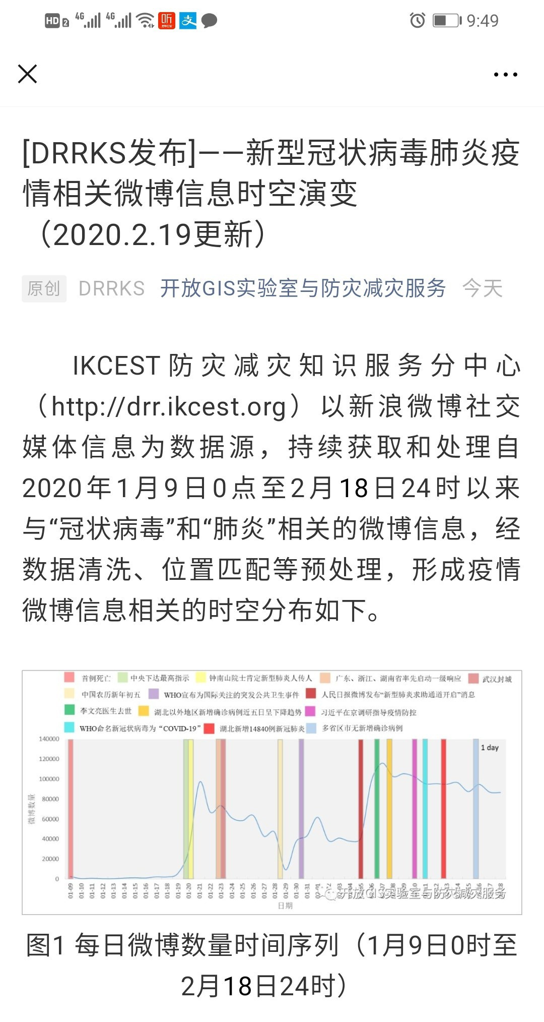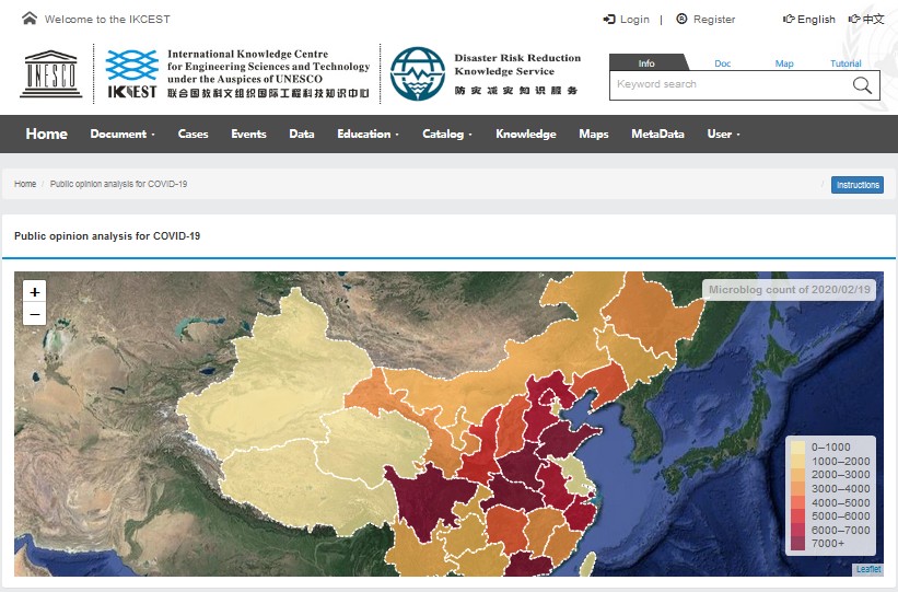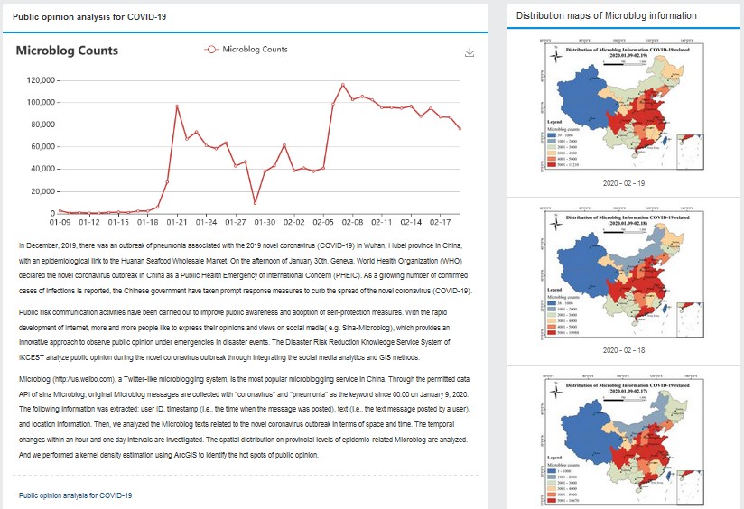 東北地理所自2016年來一直參加國際工程科技知識(shí)中心—防災(zāi)減災(zāi)知識(shí)服務(wù)系統(tǒng)(DRRKS)的開發(fā)建設(shè)工作。本次疫情期間,我所信息中心作為主要技術(shù)團(tuán)隊(duì),配合中國科學(xué)院地理科學(xué)與資源研究所開展工作,負(fù)責(zé)輿情相關(guān)信息在微信公眾號(hào)的信息推送以及 DRRKS 中英文知識(shí)應(yīng)用的開發(fā)工作。通過使用開源 WebGIS 技術(shù)與工具,對疫情相關(guān)的輿論信息在地理空間位置上進(jìn)行可視化表達(dá),對于信息公開及充分了解大數(shù)據(jù)背景下疫情輿論的時(shí)空差異及其變化具有重要意義。