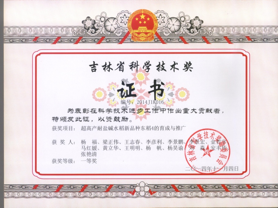 楊福團隊采用地理遠緣雜交、穿梭育種等先進育種技術(shù),歷時16年成功育成東稻4號水稻新品種。該品種集高產(chǎn)、優(yōu)質(zhì)、多抗、理想株型及廣適性于一體,尤其是耐鹽堿性和抗稻瘟病性,均明顯優(yōu)于吉林省其他主推品種;2010年獲吉林省水稻新品種高產(chǎn)競賽一等獎,畝產(chǎn)849.37公斤,創(chuàng)吉林省歷史最高紀錄;2011年獲全國優(yōu)質(zhì)食味粳稻品評一等獎。東稻4已成為吉林省中早至中熟的主推品種,2010-2014年在吉林省累計種植面積達367萬畝,在全國其他適宜地區(qū)推廣170萬畝,社會經(jīng)濟效益極其顯著。該成果為水稻育種親本應(yīng)用、育種方法和鑒定技術(shù)的改進提高奠定了基礎(chǔ),對推動吉林省水稻生產(chǎn)發(fā)展,保證國家糧食安全具有重要作用。