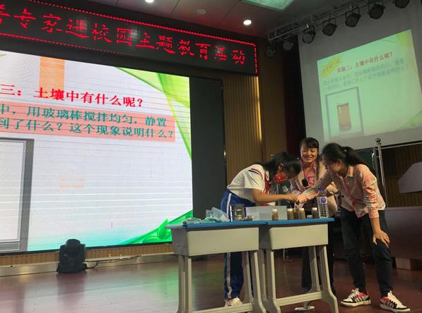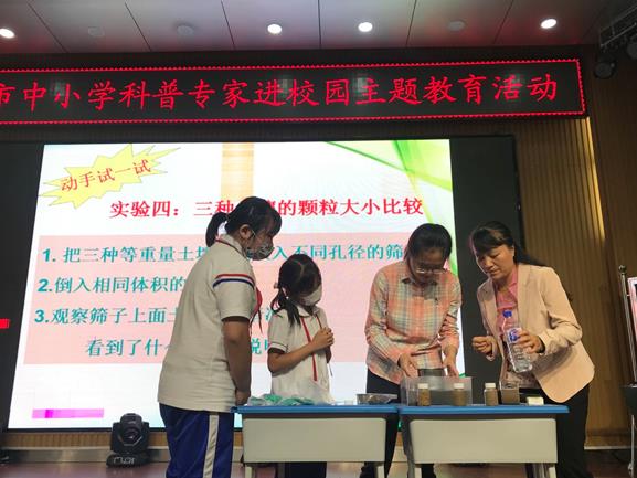 本次講座的主題為《土壤,你對腳下的她了解嗎?》。在學(xué)生的滿眼期待中,李娜以小學(xué)生們喜愛的“謎語猜猜看”和“童年回憶”拉開了本次講座的序幕。瞬時,同學(xué)們情緒高漲,有的思考,有的高舉雙手,躍躍欲試的爭相回答問題。李娜從土壤的概念、功能、組成、類型、形成、現(xiàn)狀和保護(hù)這幾個方面,進(jìn)行了生動有趣的講解。過程中,還配以多個互動實驗,邀請現(xiàn)場學(xué)生共同完成,真正實現(xiàn)了學(xué)生為主體的科學(xué)課,同學(xué)們在玩中學(xué),做中學(xué),收獲滿滿。