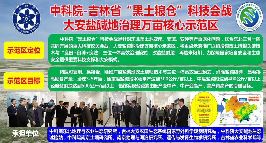 中國科學院“黑土糧倉”科技會戰(zhàn),主要是針對東北地區(qū)土地退化等嚴重威脅國家糧食安全和生態(tài)安全的重大問題,與吉林、黑龍江、遼寧與內(nèi)蒙古(三省一區(qū))聯(lián)合開展重大科技攻關(guān)任務(wù)。7月14日,為深入推進“黑土糧倉”科技會戰(zhàn),探索半干旱地區(qū)鹽堿地改良的白城經(jīng)驗和鹽堿地農(nóng)業(yè)高效發(fā)展的白城模式,中國科學院東北地理與農(nóng)業(yè)生態(tài)研究所與白城市人民政府正式簽約開展科技合作,共同開發(fā)白城市鹽堿化土地糧食增產(chǎn)的巨大潛能,大力實施以鹽堿地改良為主的黑土區(qū)邊際土地利用。目前吉林省為實現(xiàn)2030年糧食產(chǎn)量突破1000億斤目標,正在積極推進東北平原國家糧食安全產(chǎn)業(yè)帶建設(shè),提高糧食安全保障能力。目前,吉林西部仍有大面積的邊際土地和中低產(chǎn)田亟待治理,特別是70余萬畝重度鹽堿水田由于未能得到改良仍處于撂荒狀態(tài)。大力推廣以改土增糧技術(shù)為核心的“良田+良種+良法”鹽堿地高效治理模式,有望大幅度提高吉林西部鹽堿地稻作產(chǎn)量,對于保障國家糧食安全及生態(tài)安全均具有重要的現(xiàn)實意義。