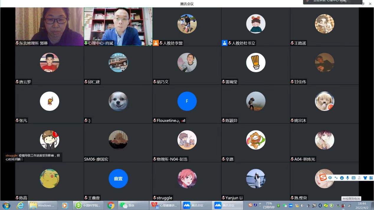 為幫助東北地理所師生在研究所靜態(tài)管理期間調(diào)適好心情,保持樂觀積極向上的健康心態(tài),增強心理保健能力,4月2日,東北地理所邀請中國科學院大學心理健康教育中心主任肖斌在線上舉辦了“穩(wěn)定自我,面對挑戰(zhàn)”的心理健康專題交流會。交流會以回答問題交流的形式進行,由人事教育處處長郭琳主持,研究生、導師共計200余人參會。