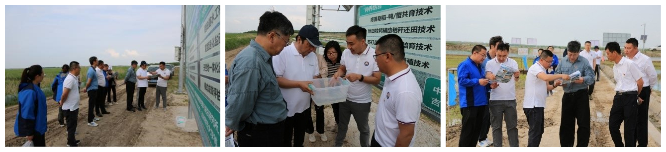 在濕地示范基地,文波龍副研究員詳細(xì)介紹了濕地模式運(yùn)行情況以及鹽堿稻田-濕地系統(tǒng)資源高效、生態(tài)健康一體化方案的整體思路,并結(jié)合現(xiàn)場詳細(xì)講解了研發(fā)和集成的蘇打鹽堿水型蟹種培育、以養(yǎng)促改蘇打鹽堿地綜合利用、秋田放牧輔助秸稈還田、灌區(qū)退水工程濕地消納、鹽堿退化濕地恢復(fù)、天然濕地魚蟹生態(tài)放養(yǎng)、葦基食用菌栽培等關(guān)鍵技術(shù)內(nèi)容。