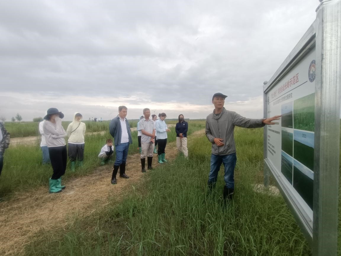 在大安牛心套保濕地示范基地,濕地模式負(fù)責(zé)人文波龍?jiān)敿?xì)介紹了濕地模式運(yùn)行情況以及鹽堿稻田-濕地系統(tǒng)資源高效、生態(tài)健康一體化方案的整體思路及其當(dāng)前運(yùn)行情況,現(xiàn)場講解了灌區(qū)退水工程濕地消納、鹽堿退化濕地恢復(fù)方面的示范工作進(jìn)展;劉宏遠(yuǎn)助理研究員詳細(xì)講解了蘇打鹽堿稻田以養(yǎng)促改、蟹種培育以及秋田放牧輔助秸稈還田等技術(shù)研發(fā)和示范工作,李曉宇副研究員介紹了沼澤濕地魚蟹生態(tài)放養(yǎng)、葦基食用菌栽培等濕地合理利用關(guān)鍵技術(shù)內(nèi)容。