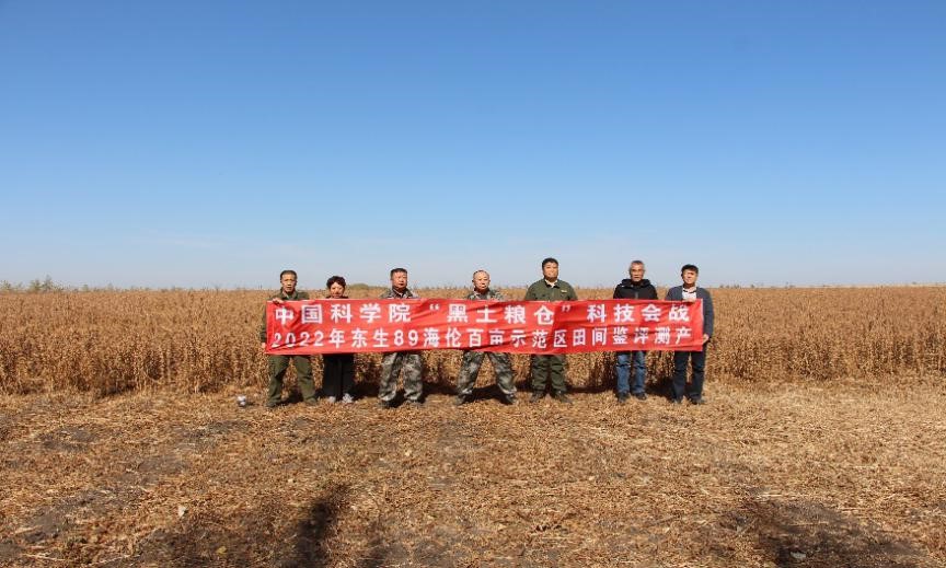 今秋喜報又傳。2022年秋季,來自黑龍江省農(nóng)業(yè)科學院、綏化市農(nóng)業(yè)技術推廣中心、雙鴨山市質(zhì)量技術檢測中心等單位的12位省級專家分成2組測產(chǎn),專家組分別在黑龍江省海倫市長發(fā)鎮(zhèn)百畝示范田和友誼縣一分場百畝示范田分別對中國科學院“黑土糧倉”科技會戰(zhàn)項目—大豆新品種“東生89”和中國科學院重點部署項目“大豆高產(chǎn)穩(wěn)產(chǎn)分子基礎與品種培育”——大豆新品種“東生201”百畝示范田進行實地測產(chǎn),專家組嚴格按照理論測產(chǎn)和實際測產(chǎn)結(jié)合方法,通過隨機抽樣選點、稱重量、量密度、田間收獲等方式,現(xiàn)場測量,測產(chǎn)結(jié)果矮桿耐密品種“東生89”在海倫市示范田畝產(chǎn)256.99公斤,“東生201”在友誼農(nóng)場百畝示范田畝產(chǎn)270.8公斤,均超額完成創(chuàng)高產(chǎn)的既定目標。