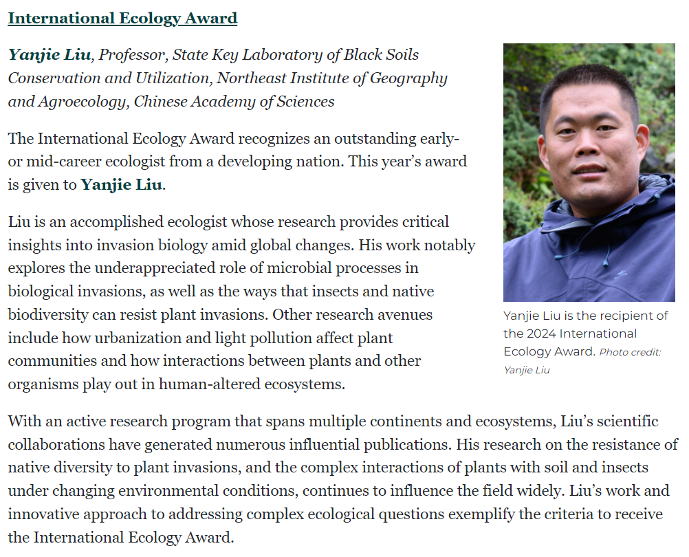 ????2024年5月30日,美國生態(tài)學會發(fā)布了“國際生態(tài)學獎”名單,中國科學院東北地理與農業(yè)生態(tài)研究所生物入侵生態(tài)學科組負責人劉艷杰研究員獲獎。