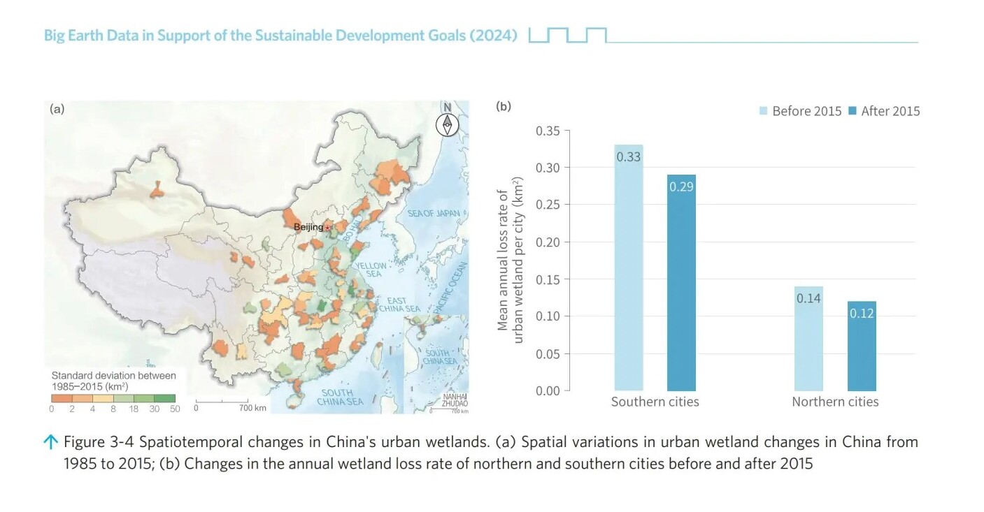 東北地理所濕地遙感學(xué)科組毛德華研究員等完成的案例《1985-2022年中國城市濕地變化》入選該報告。該案例對應(yīng)SDG 6.6.1,研發(fā)了大尺度、快速的城市濕地遙感分類方法,構(gòu)建了1985-2022年逐年城市濕地分布數(shù)據(jù)集,揭示了中國主要城市內(nèi)城市濕地分布的年際變化趨勢和時空異質(zhì)性。