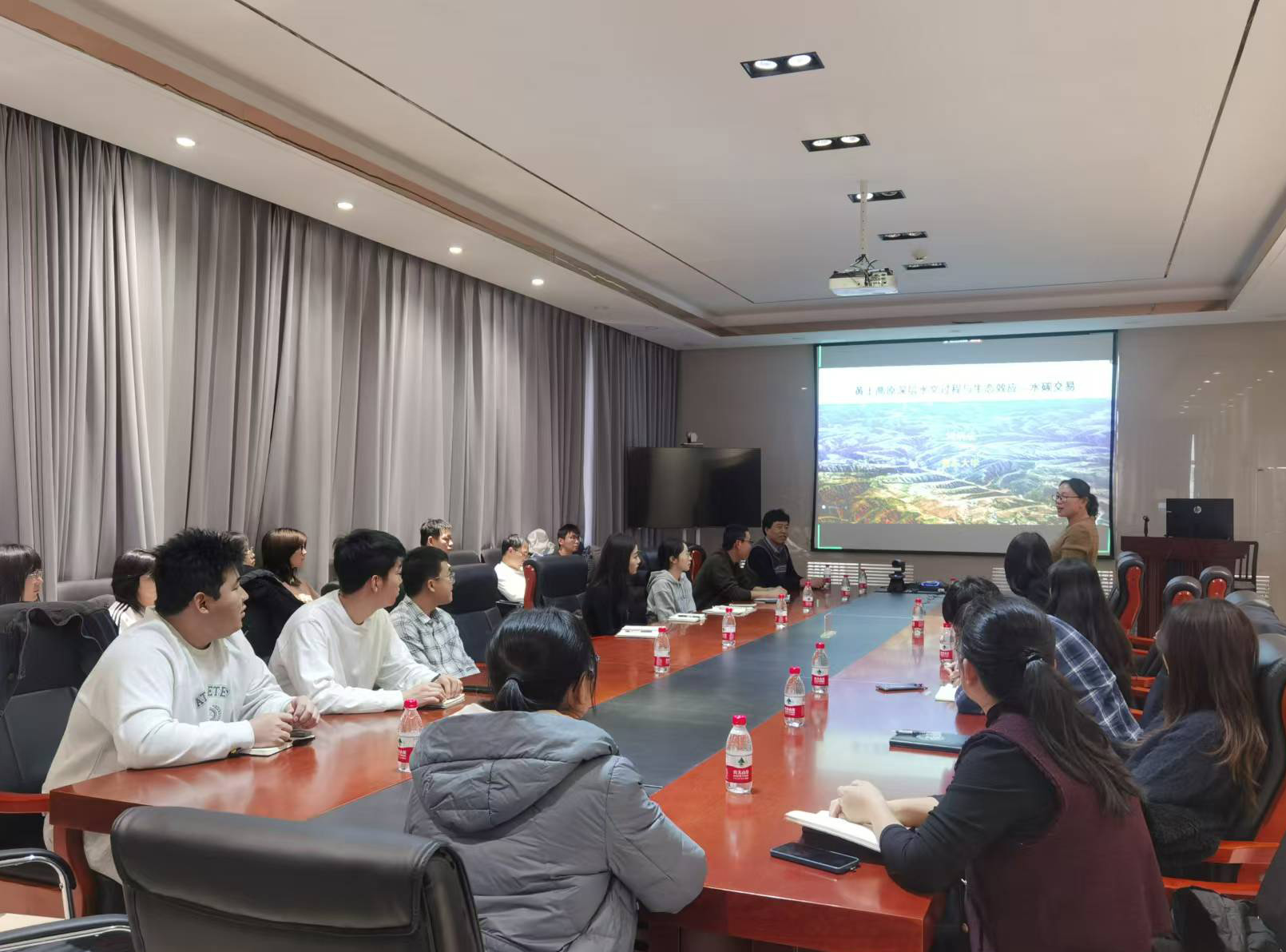 司炳成教授以“相較于淺根植物,深根系植物如何影響地下水補給?如何消耗深層土壤水?能不能增加地下碳儲存?”三個問題開篇,詳細講解了淺根系與深根系植被下地下水補給的控制因子,探討了地下水同位素與補給機制,介紹了深層土壤水與碳的交換過程。司炳成教授還展示了基于林齡與深層土壤水分虧缺之間的邏輯增長關(guān)系模型,用于估算區(qū)域尺度人工林的深層土壤水分虧缺,并介紹了基于深層土壤水分虧缺與深層根系碳儲量之間的Logistic關(guān)系模型,估算了區(qū)域尺度人工林的深層根系碳儲量。司炳成教授的報告深入淺出,極具指導(dǎo)意義,激發(fā)了所在領(lǐng)域科研人員和研究生的思考。與會師生與司炳成教授展開了深入交流,收獲了寶貴的學術(shù)啟發(fā)。