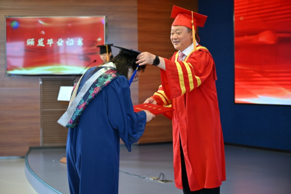 在學位授予儀式環(huán)節(jié)中,畢業(yè)生依次上臺,姜明為全體畢業(yè)生頒發(fā)了畢業(yè)證書,并為畢業(yè)生扶正流蘇,合影留念。