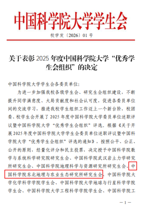 為加強(qiáng)學(xué)生組織建設(shè)、樹(shù)立先鋒榜樣,中國(guó)科學(xué)院大學(xué)開(kāi)展了2025年度“優(yōu)秀學(xué)生會(huì)組織”評(píng)選,授予包括中國(guó)科學(xué)院東北地理與農(nóng)業(yè)生態(tài)研究所(以下簡(jiǎn)稱“東北地理所”)研究生會(huì)在內(nèi)的16個(gè)學(xué)生會(huì)組織“優(yōu)秀學(xué)生會(huì)組織”稱號(hào),這是東北地理所研究生會(huì)首次獲此表彰。