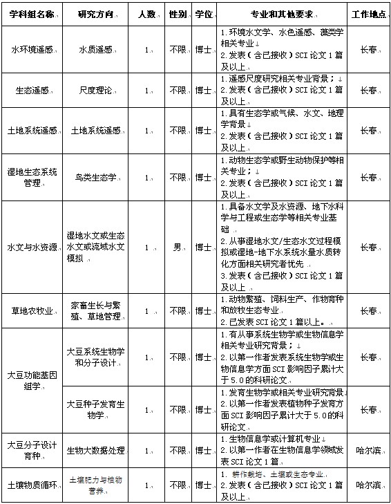 中國(guó)科學(xué)院東北地理與農(nóng)業(yè)生態(tài)研究所(簡(jiǎn)稱“東北地理所”)是設(shè)在東北地區(qū)的綜合性地理學(xué)與農(nóng)業(yè)生態(tài)學(xué)研究機(jī)構(gòu),針對(duì)保障國(guó)家糧食安全、生態(tài)安全和振興東北老工業(yè)基地的重大戰(zhàn)略需求,以濕地生態(tài)、區(qū)域農(nóng)業(yè)、地理遙感、環(huán)境與區(qū)域發(fā)展等為重點(diǎn)研究方向,建立基于地表系統(tǒng)過程的濕地科學(xué)、農(nóng)業(yè)生態(tài)學(xué)創(chuàng)新體系和研究基地,以及相關(guān)領(lǐng)域的高級(jí)人才培養(yǎng)基地。根據(jù)學(xué)科發(fā)展需要和創(chuàng)新“2020”發(fā)展要求,現(xiàn)面向社會(huì)公開招聘科研和管理人才,誠(chéng)邀有識(shí)之士應(yīng)聘。招聘工作嚴(yán)格遵循公平、公正、公開、競(jìng)爭(zhēng)、擇優(yōu)的原則。