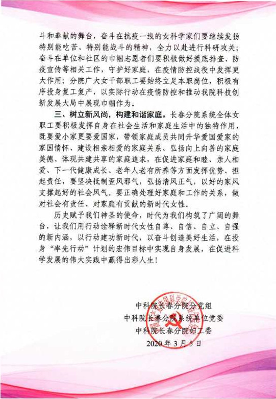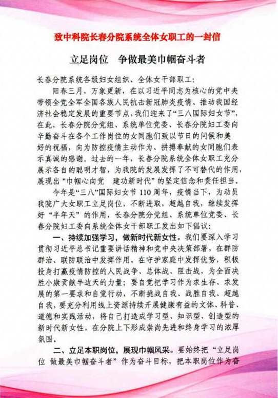 致中科院長春分院系統(tǒng)全體女職工的一封信立足崗位 爭做最美巾幗奮斗者