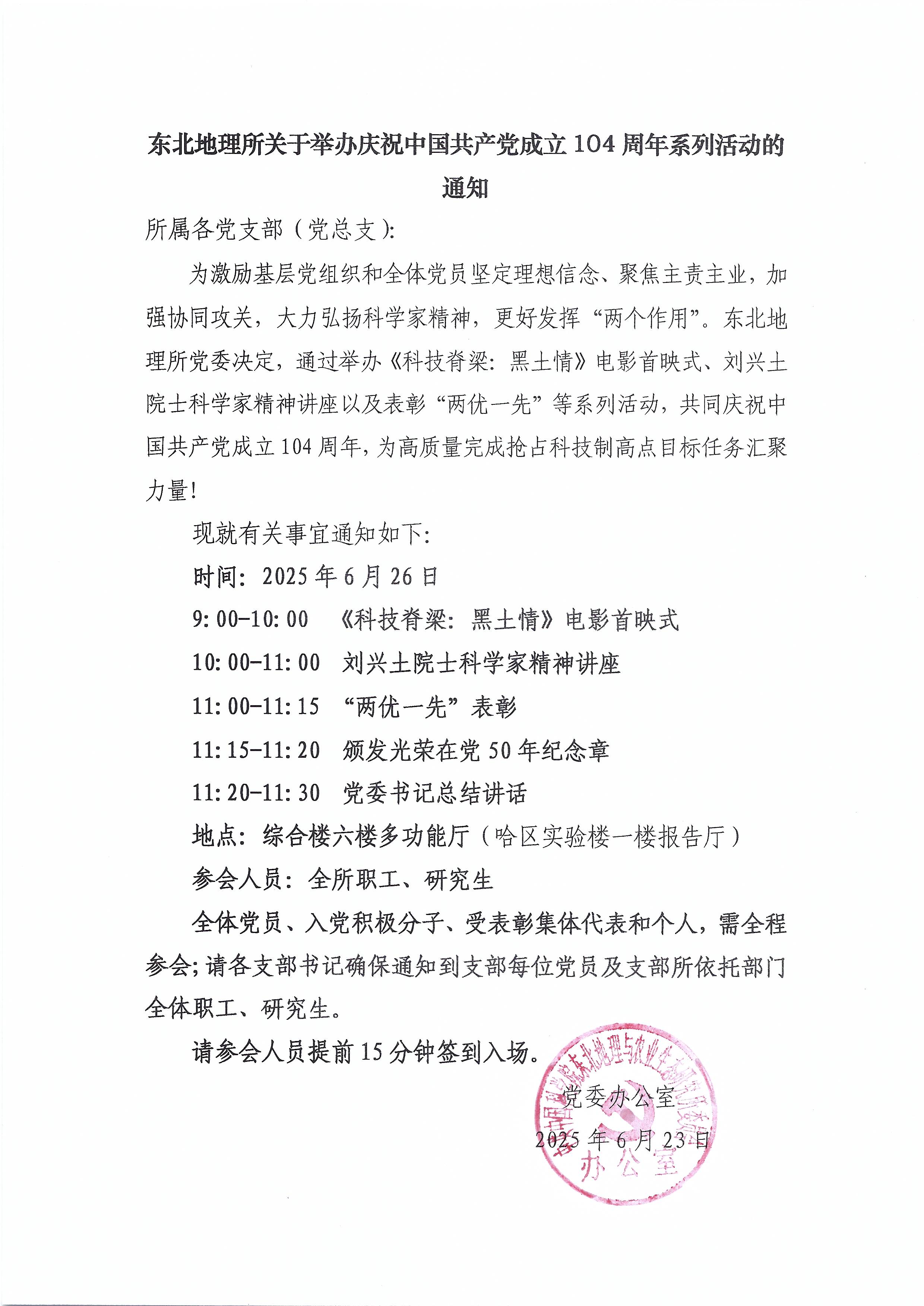 東北地理所關(guān)于舉辦慶祝中國(guó)共產(chǎn)黨成立104周年系列活動(dòng)的通知