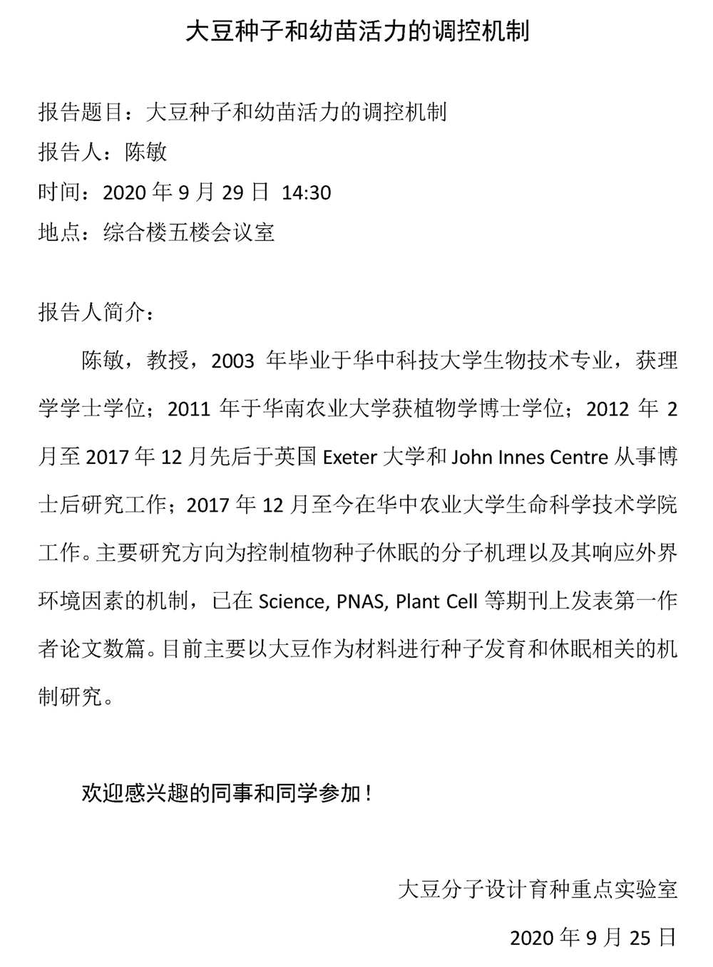 大豆種子和幼苗活力的調(diào)控機制-陳敏 教授