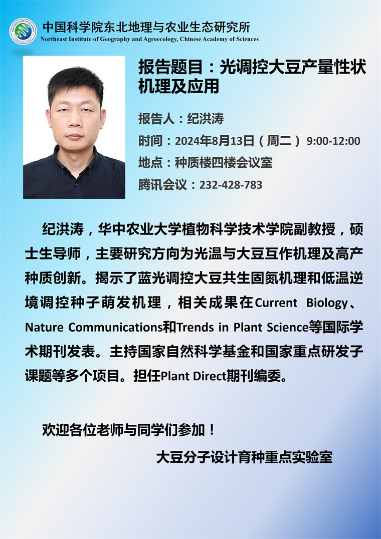 光調(diào)控大豆產(chǎn)量性狀機(jī)理及應(yīng)用-紀(jì)洪濤 副教授